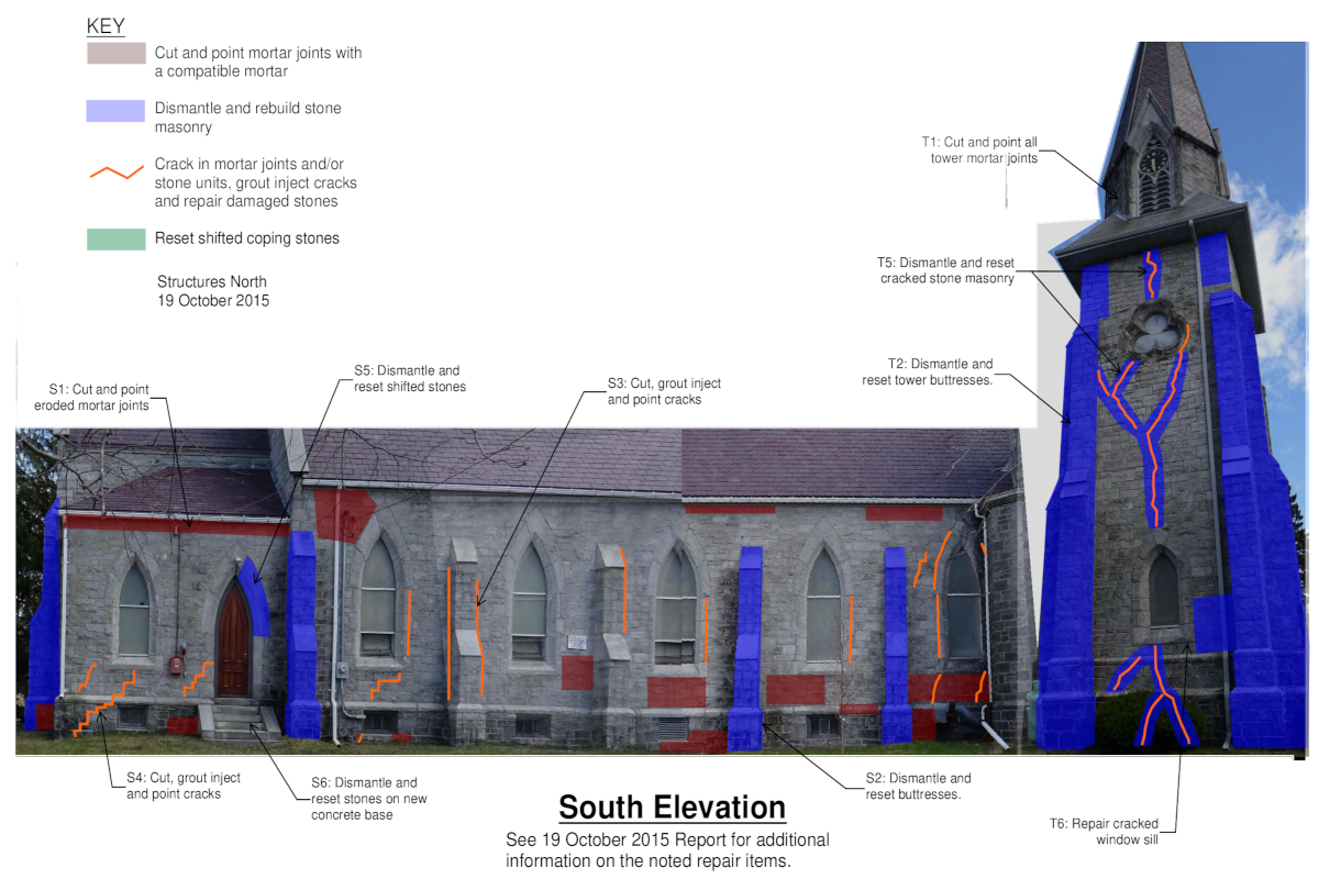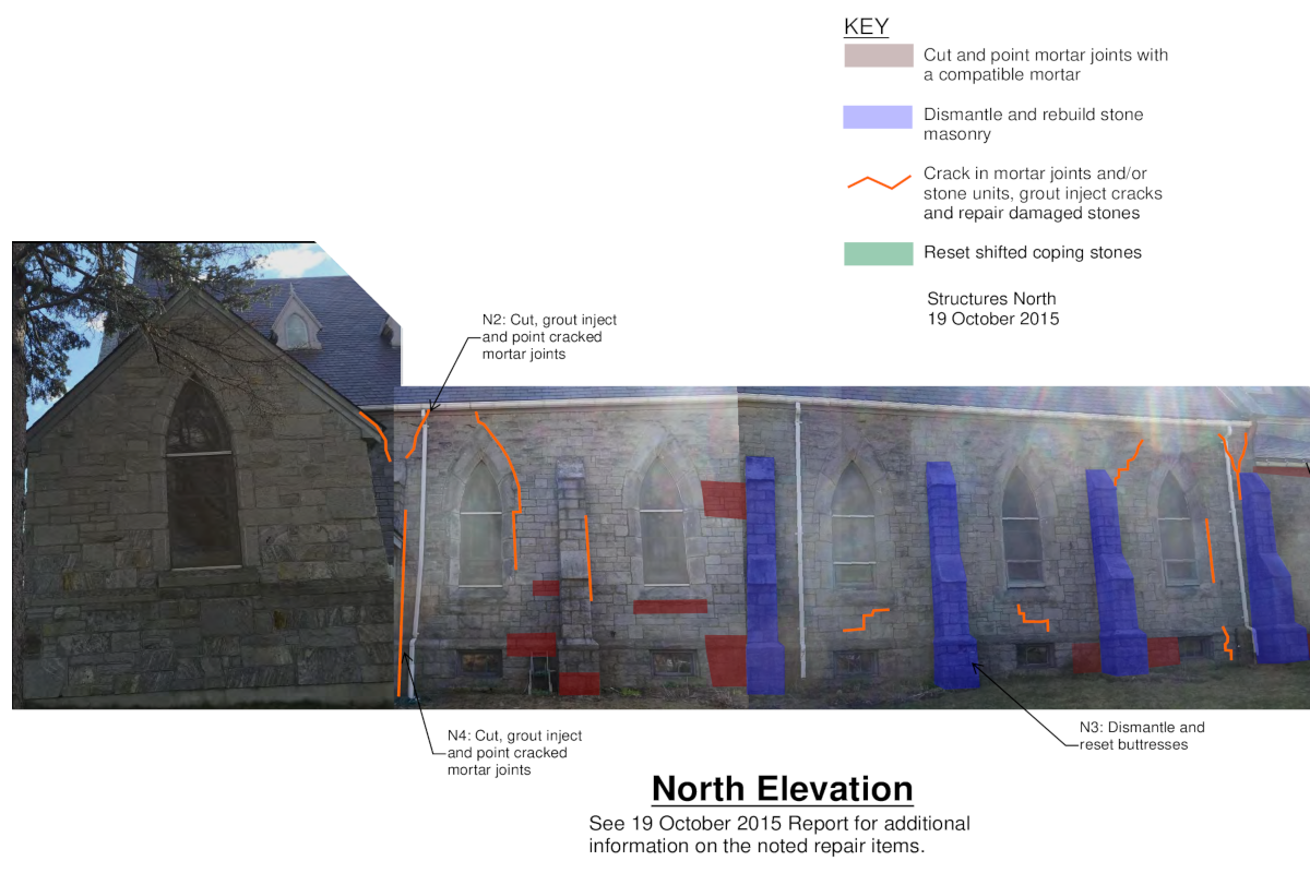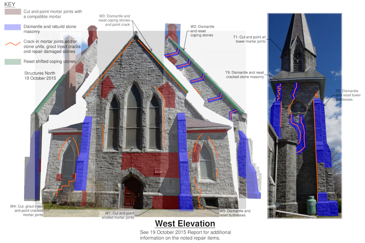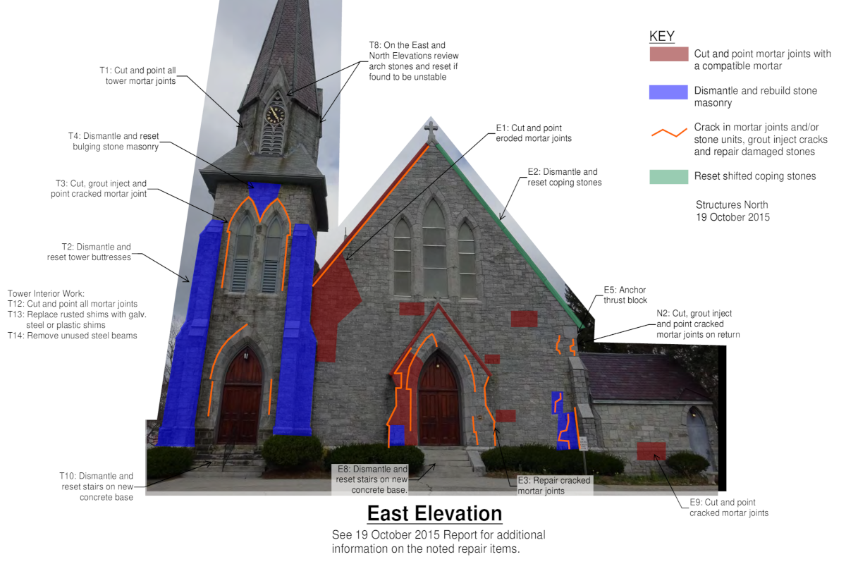 A casual walk around the big gray church quickly reveals the damage the granite stonework has suffered from years of wind, sun, rain and extreme temperature changes. Many mortar joints are in a state of disrepair, with the mortar filling either cracked or completely missing. All of this needs to be replaced and/or refilled.